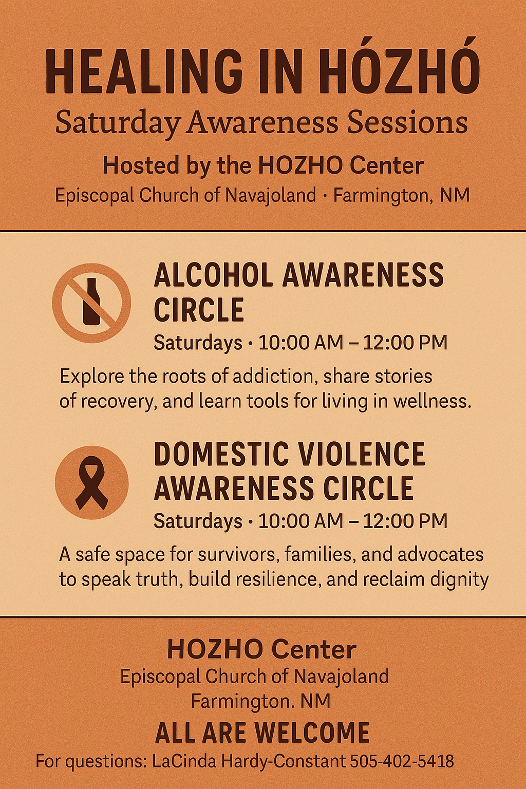 You're invited to join us for Healing in Hózhó, a series of Saturday Awareness Sessions hosted by the HOZHO Center and led by LaCinda Hardy-Constant, BSW, MSW-Student (LSAA). These gatherings are open to anyone looking to heal, support others, or listen with an open heart. We come together as a community to raise awareness, restore balance, […] |