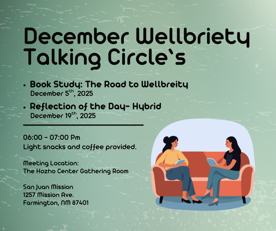 Join us either in-person or via Zoom for Wellbriety, hosted by Cindy Hardy, on Friday, December 19, starting at 6 PM in the Hozho Building. Light snacks and refreshments will be provided. |