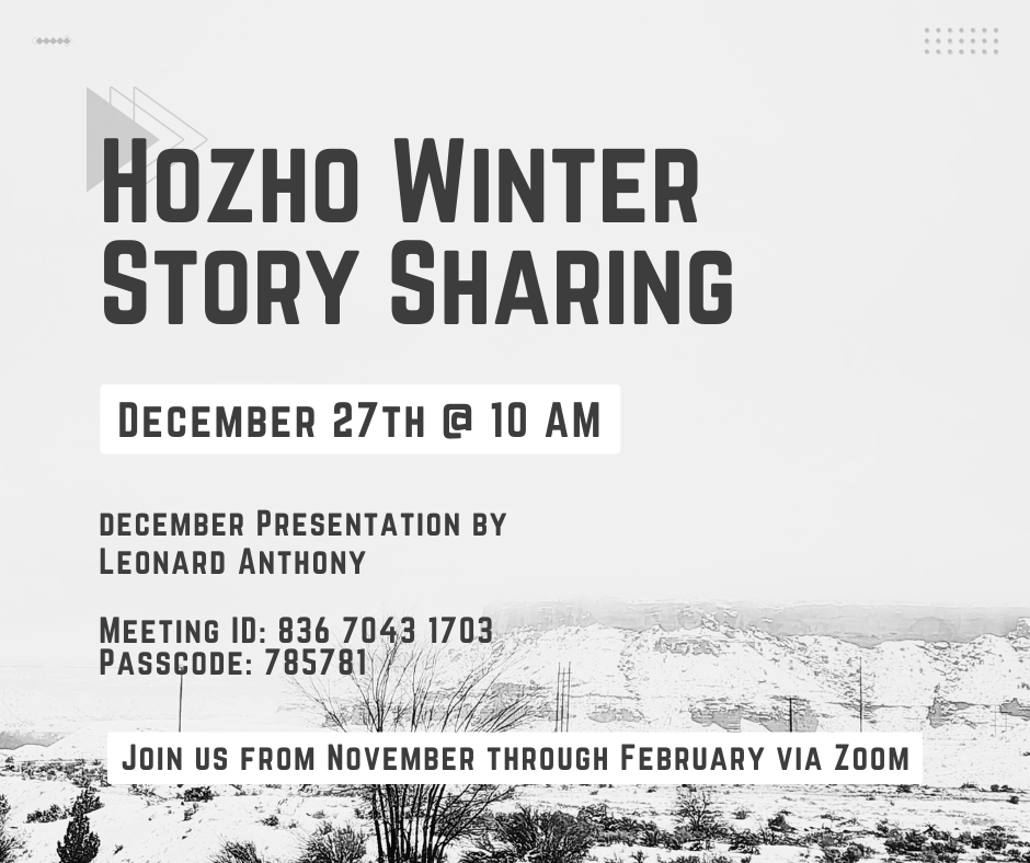 Join us as we welcome back Leonard Anthony for our Hozho Winter Story Sharing session on December 27, starting at 10 AM via Zoom. |